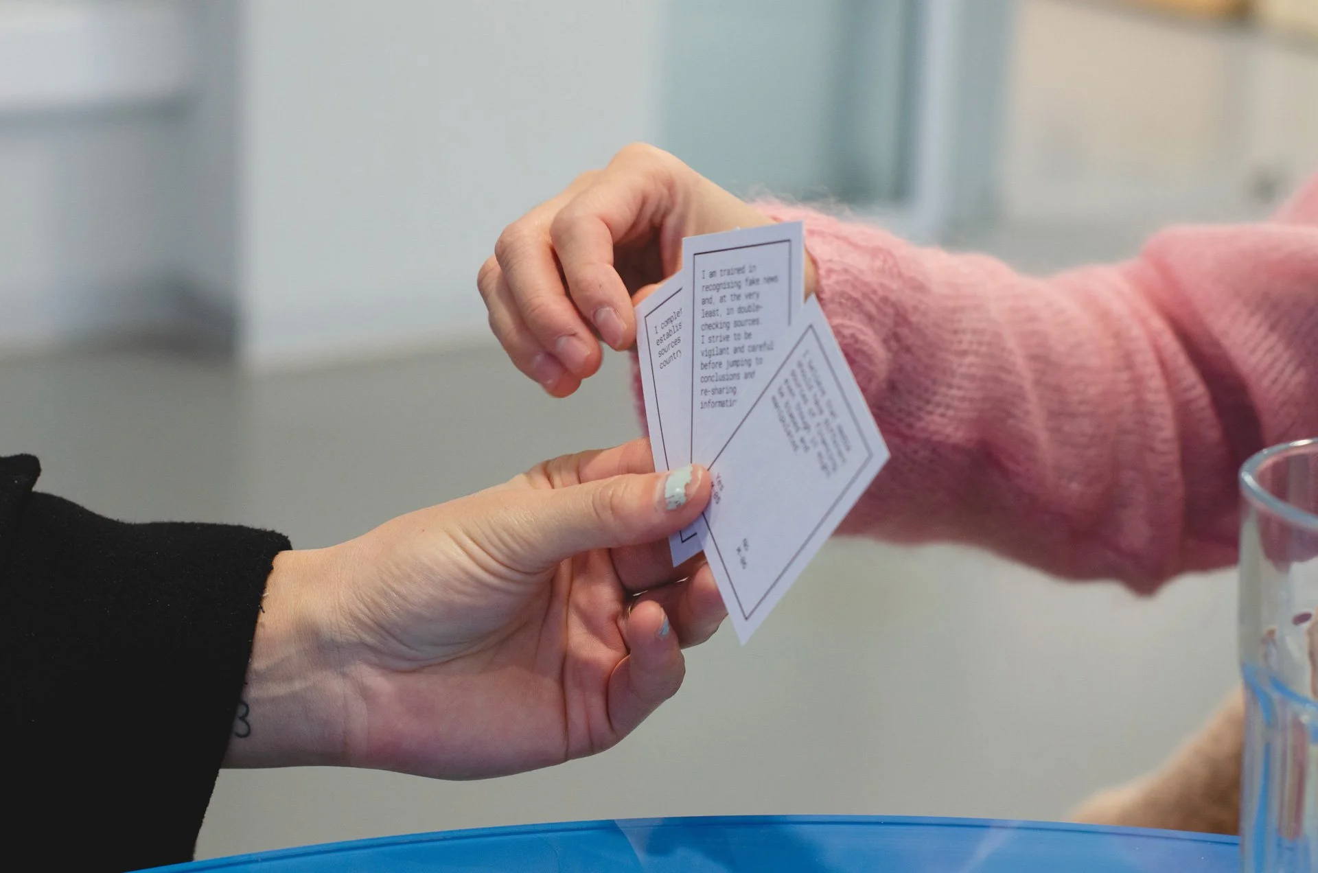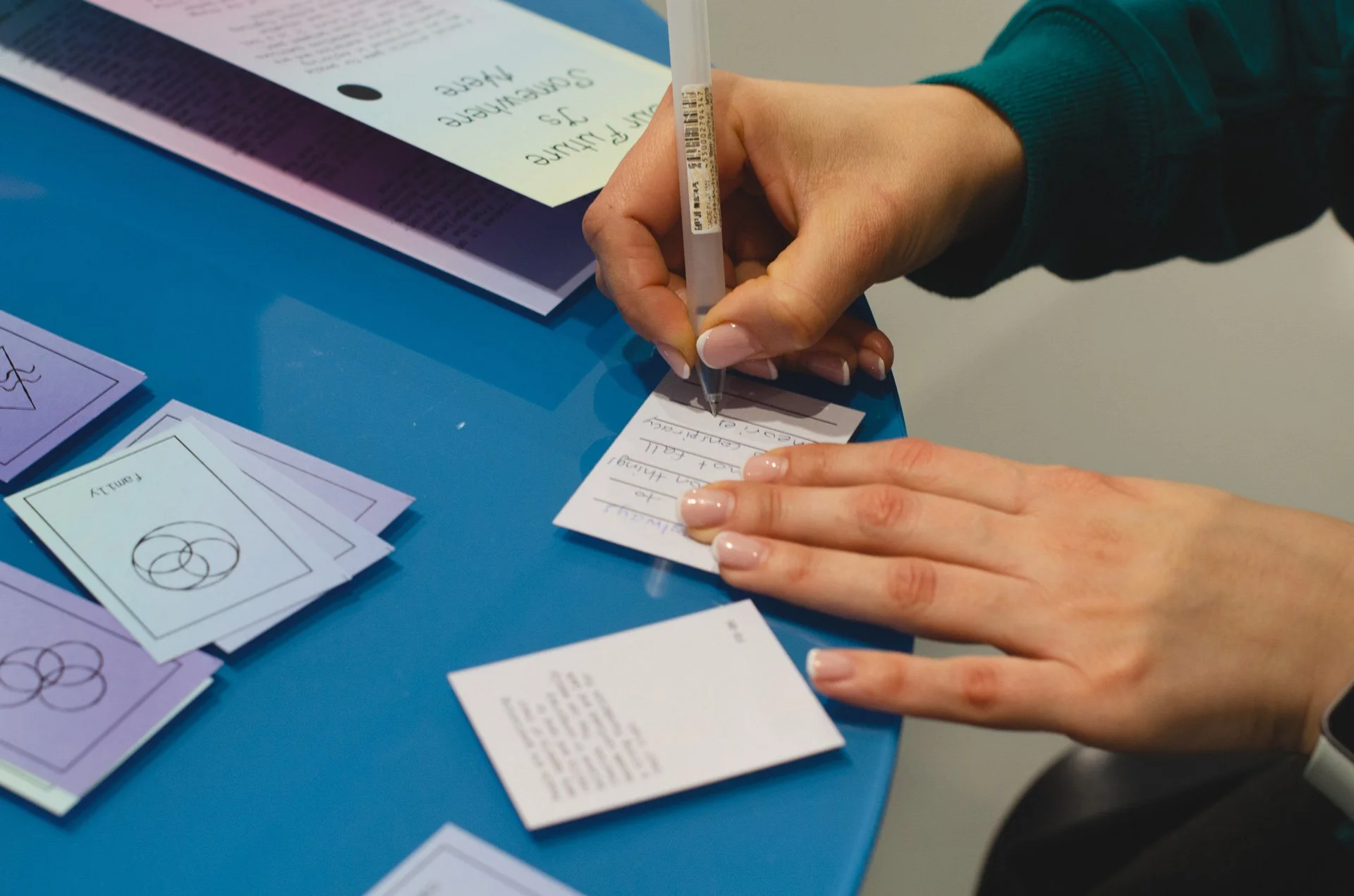 Our Future Is Somewhere Here is a social artistic game for people who are interested in exploring potential future scenarios and are open to asking themselves questions about the relation between past, present, and future. It is a tool for people to have valuable conversations without fighting about today's hot topics.